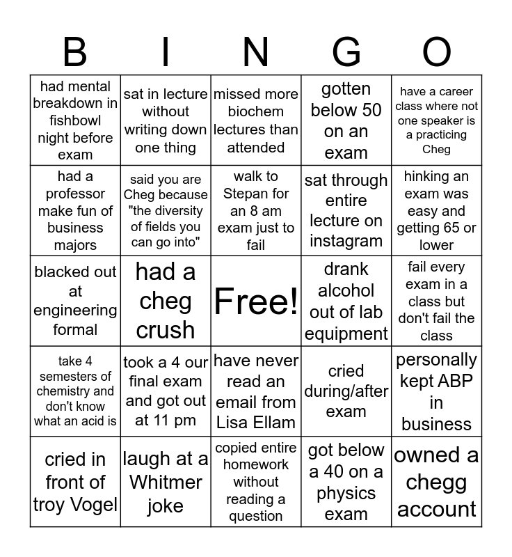 This bingo card has a free space and 34 words: learned paul Helquist isn't a cute little old guy. instead he is the man who ruins ur GPA., got below a 40 on a physics exam, had a 3 hour lab Friday afternoons, question why you are Cheg everyday, take 4 semesters of chemistry and don't know what an acid is, said you are Cheg because "the diversity of fields you can go into", have a career class where not one speaker is a practicing Cheg, cried in front of troy Vogel, sat in lecture without writing down one thing, fail Orgo exam, go to breakfast, fail thermo exam, walk to Stepan for an 8 am exam just to fail, missed more biochem lectures than attended, was told this would be the hardest semester every semester, had to miss a thirsty Thursday because of 6 classes Friday, drank alcohol out of lab equipment, hinking an exam was easy and getting 65 or lower, laugh at a Whitmer joke, blacked out at engineering formal, took a 4 our final exam and got out at 11 pm, cried during/after exam, have never read an email from Lisa Ellam, left office hours more confused than when you got there, had mental breakdown in fishbowl night before exam, fail every exam in a class but don't fail the class, copied entire homework without reading a question, owned a chegg account, gotten below 50 on an exam, finished HW on a friday morning hungover, sat through entire lecture on instagram, had a professor make fun of business majors, thought you'd end up as a consultant & got sad, had a cheg crush, personally kept ABP in business and got to library sunday morning before it opened.