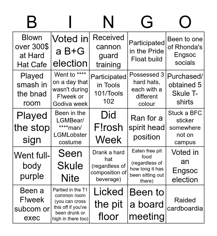 This bingo card has a free space and 33 words: Hidden/ retrieved something from the pit ceiling, Went to a parade with the bnad, Been in the LGMBear/ ****man/ LGMLobster costume, Slept overnight in the pit, Went full-body purple, Went to **** on a day that wasn't during F!week or Godiva week, Been to one of Rhonda's Engsoc socials, Been a F!week subcom or exec, Voted in a B+G election, Been to Shai Cohen's office hours, Participated in Tools 101/Tools 102, Received cannon guard training, Became **** server trained, Received Skule Kup points for your discipline, Ran for a spirit head position, Purchased/ obtained 5 Skule T-shirts, Partied in the T1 common room (you can cross this off if you've been drunk or high in there too), Played the stop sign, Seen Skule Nite, Eaten free pit food (regardless of how long it has been sitting out there), Drank a hard hat (regardless of composition of beverage), Pulled a prank-all-nighter (past 5am), Blown over 300$ at Hard Hat Cafe, Stuck a BFC sticker somewhere not on campus, Licked the pit floor, Raided cardboardia, Participated in the Pride Float build, Possessed 3 hard hats, each with a different colour, Played smash in the bnad room, Voted in an Engsoc election, Applied for a Project Directorship, Been to a board meeting and Purchased a Skulebook.