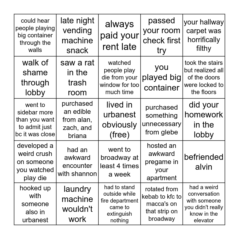 This bingo card has a free space and 24 words: had an awkward encounter with shannon, laundry machine wouldn't work, watched people play die from your window for too much time, hooked up with someone also in urbanest, your hallway carpet was horrifically filthy, could hear people playing big container through the walls, walk of shame through lobby, late night vending machine snack, purchased something unnecessary from glebe, went to broadway at least 4 times a week, you played big container, went to sidebar more than you want to admit just bc it was close, hosted an awkward pregame in your apartment, befriended alvin, saw a rat in the trash room, rotated from kebab to kfc to macca's on that strip on broadway, did your homework in the lobby, always paid your rent late, took the stairs but realized all of the doors were locked to the floors, purchased an edible from alan, zach, and briana, had a weird conversation with someone you didn't really know in the elevator, developed a weird crush on someone you watched play die, passed your room check first try and had to stand outside while fire department came to extinguish nothing.