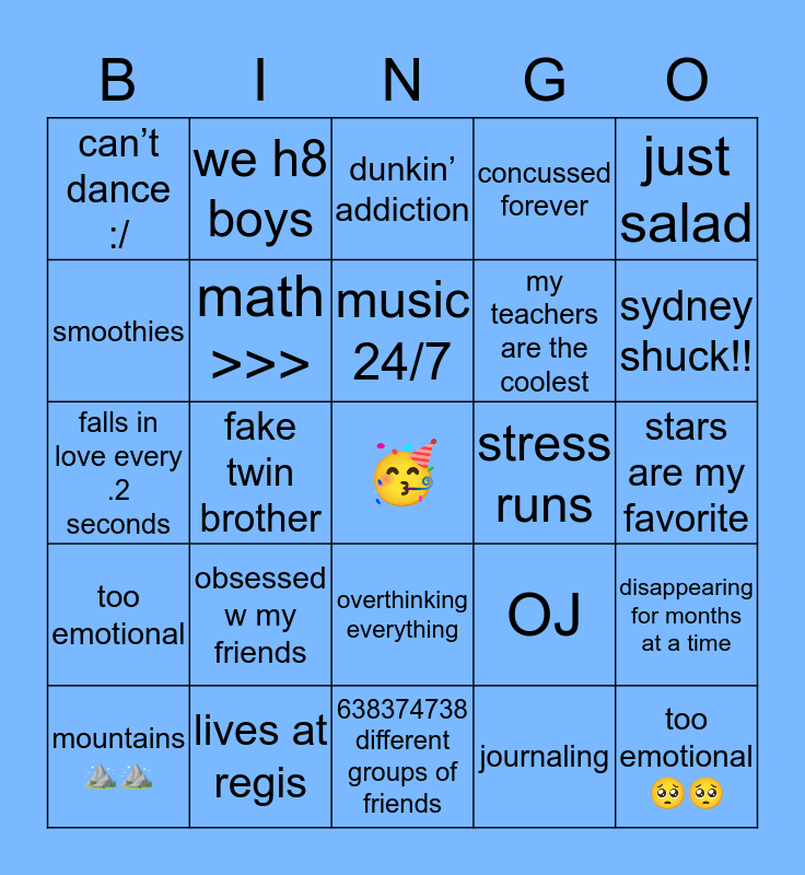 This bingo card has a free space and 24 words: mountains ⛰⛰, obsessed w my friends, music 24/7, journaling, just salad, can’t dance :/, we h8 boys, dunkin’ addiction, stress runs, stars are my favorite, falls in love every .2 seconds, math >>>, OJ, disappearing for months at a time, smoothies, lives at regis, 638374738 different groups of friends, concussed forever, sydney shuck!!, too emotional, fake twin brother, overthinking everything, my teachers are the coolest and too emotional 🥺🥺.