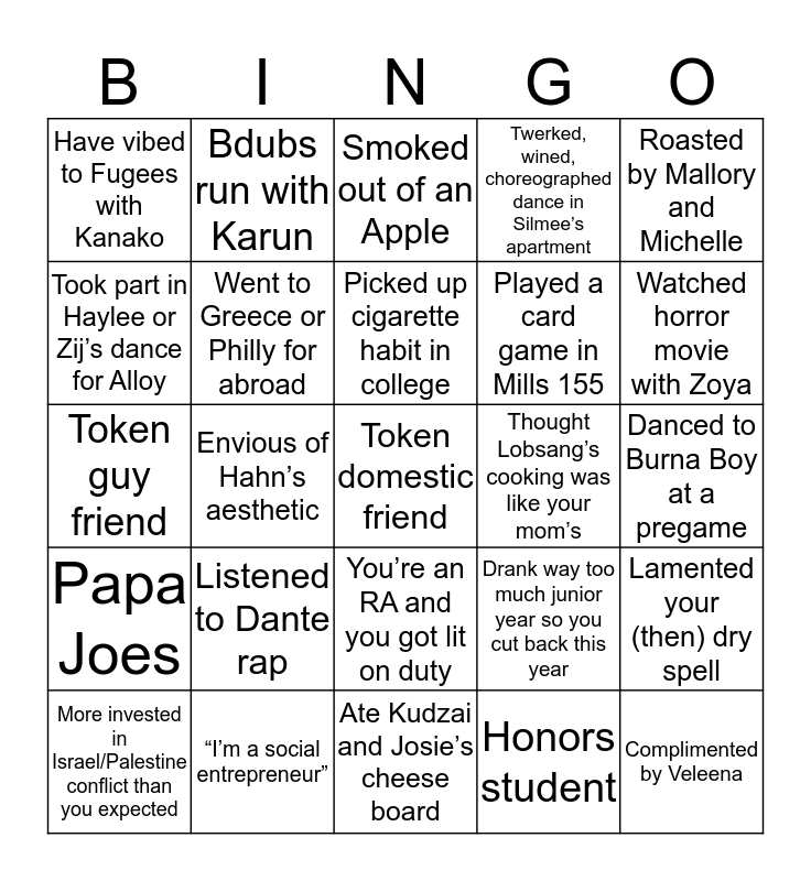 This bingo card has a free space and 24 words: Listened to Dante rap, “I’m a social entrepreneur”, Picked up cigarette habit in college, More invested in Israel/Palestine conflict than you expected, Roasted by Mallory and Michelle, Have vibed to Fugees with Kanako, Took part in Haylee or Zij’s dance for Alloy, Bdubs run with Karun, Thought Lobsang’s cooking was like your mom’s, You’re an RA and you got lit on duty, Played a card game in Mills 155, Token guy friend, Drank way too much junior year so you cut back this year, Lamented your (then) dry spell, Went to Greece or Philly for abroad, Honors student, Danced to Burna Boy at a pregame, Smoked out of an Apple, Watched horror movie with Zoya, Envious of Hahn’s aesthetic, Complimented by Veleena, Papa Joes, Twerked, wined, choreographed dance in Silmee’s apartment and Ate Kudzai and Josie’s cheese board.