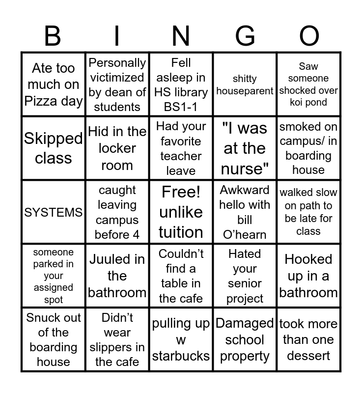 This bingo card has a free space and 24 words: Juuled in the bathroom, Didn’t wear slippers in the cafe, Had your favorite teacher leave, Snuck out of the boarding house, Saw someone shocked over koi pond, Ate too much on Pizza day, Skipped class, Personally victimized by dean of students, Awkward hello with bill O’hearn, Couldn’t find a table in the cafe, "I was at the nurse", SYSTEMS, Hated your senior project, Hooked up in a bathroom, Hid in the locker room, Damaged school property, walked slow on path to be late for class, Fell asleep in HS library BS1-1, smoked on campus/ in boarding house, caught leaving campus before 4, took more than one dessert, someone parked in your assigned spot, shitty houseparent and pulling up w starbucks.