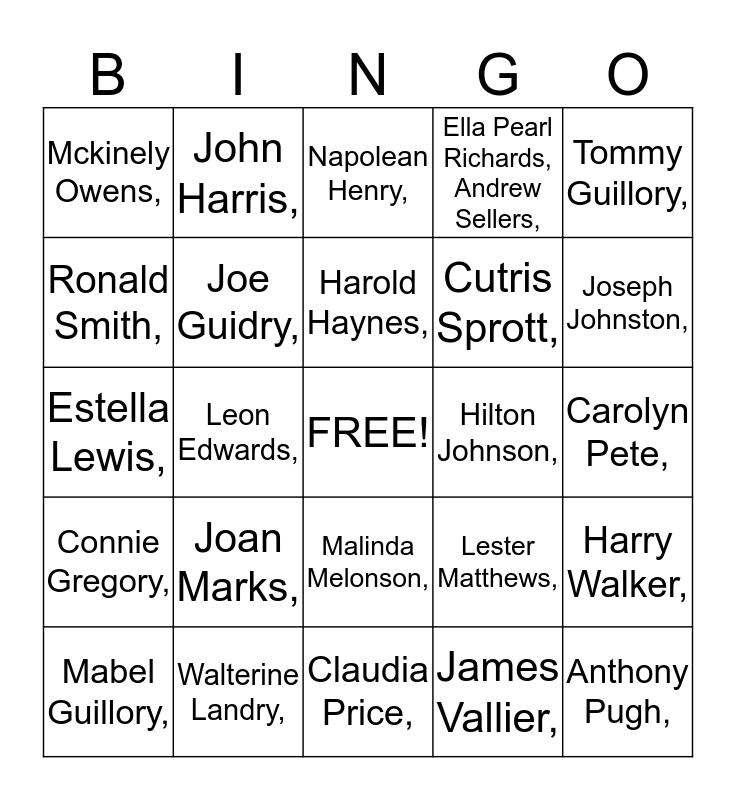 This bingo card has a free space and 33 words: Sharon Bossette,, Lemond Davis,, Leon Edwards,, Elinor Green,, Connie Gregory,, Joe Guidry,, Tommy Guillory,, Mabel Guillory,, John Harris,, Margaret Harris,, Harold Haynes,, Napolean Henry,, Joseph Hopper,, Ivory Jackson,, Hilton Johnson,, Joseph Johnston,, Walterine Landry,, Estella Lewis,, Joan Marks,, Lester Matthews,, Malinda Melonson,, Lawrence Mickens,, Mckinely Owens,, Carolyn Pete,, Claudia Price,, Anthony Pugh,, Ella Pearl Richards, Andrew Sellers,, Cutris Sprott,, Ronald Smith,, Harry Walker,, Ulysses Washington, Sylvia Woodard,, James Vallier, and Lillian Bernard.