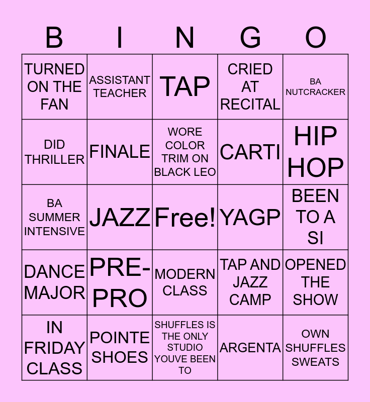 This bingo card has a free space and 24 words: PRE-PRO, POINTE SHOES, WORE COLOR TRIM ON BLACK LEO, IN FRIDAY CLASS, BA NUTCRACKER, TURNED ON THE FAN, DID THRILLER, ASSISTANT TEACHER, YAGP, MODERN CLASS, CARTI, BA SUMMER INTENSIVE, TAP AND JAZZ CAMP, OPENED THE SHOW, FINALE, ARGENTA, BEEN TO A SI, TAP, HIP HOP, JAZZ, OWN SHUFFLES SWEATS, DANCE MAJOR, CRIED AT RECITAL and SHUFFLES IS THE ONLY STUDIO YOUVE BEEN TO.
