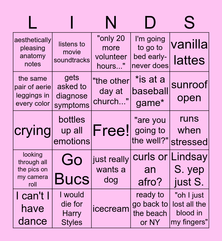 This bingo card has a free space and 24 words: Go Bucs, I would die for Harry Styles, "the other day at church...", I can't I have dance, vanilla lattes, aesthetically pleasing anatomy notes, the same pair of aerie leggings in every color, listens to movie soundtracks, "are you going to the well?", just really wants a dog, *is at a baseball game*, crying, curls or an afro?, Lindsay S. yep just S., gets asked to diagnose symptoms, ready to go back to the beach or NY, runs when stressed, "only 20 more volunteer hours...", sunroof open, bottles up all emotions, "oh I just lost all the blood in my fingers", looking through all the pics on my camera roll, I'm going to go to bed early- never does and icecream.