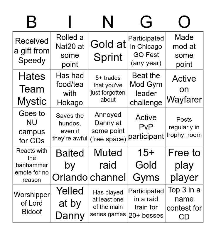 This bingo card has a free space and 24 words: Baited by Orlando, Yelled at by Danny, 5+ trades that you've just forgotten about, Worshipper of Lord Bidoof, Made mod at some point, Received a gift from Speedy, Hates Team Mystic, Rolled a Nat20 at some point, Active PvP participant, Muted raid channel, Beat the Mod Gym leader challenge, Goes to NU campus for CDs, 15+ Gold Gyms, Free to play player, Has had food/tea with Hokago, Participated in a raid train for 20+ bosses, Posts regularly in trophy_room, Gold at Sprint, Active on Wayfarer, Saves the hundos, even if they're awful, Top 3 in a name contest for CD, Reacts with the banhammer emote for no reason, Participated in Chicago GO Fest (any year) and Has played at least one of the main series games.
