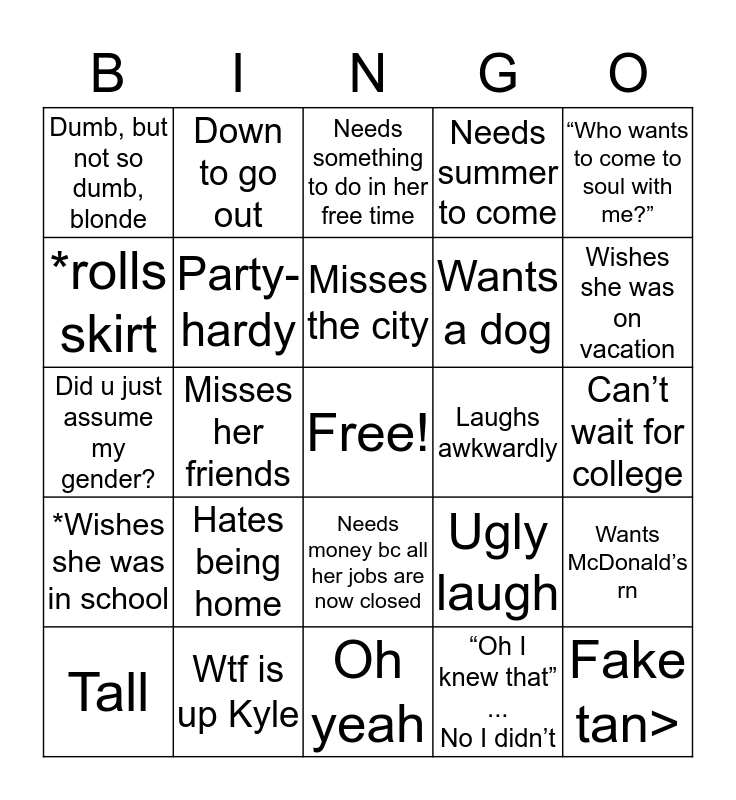 This bingo card has a free space and 24 words: Tall, Hates being home, Misses the city, “Oh I knew that” ... No I didn’t, “Who wants to come to soul with me?”, Dumb, but not so dumb, blonde, Down to go out, Needs something to do in her free time, Laughs awkwardly, Can’t wait for college, Did u just assume my gender?, Party-hardy, Ugly laugh, Wants McDonald’s rn, *rolls skirt, Wtf is up Kyle, Oh yeah, Needs summer to come, Wishes she was on vacation, *Wishes she was in school, Misses her friends, Needs money bc all her jobs are now closed, Wants a dog and Fake tan>.