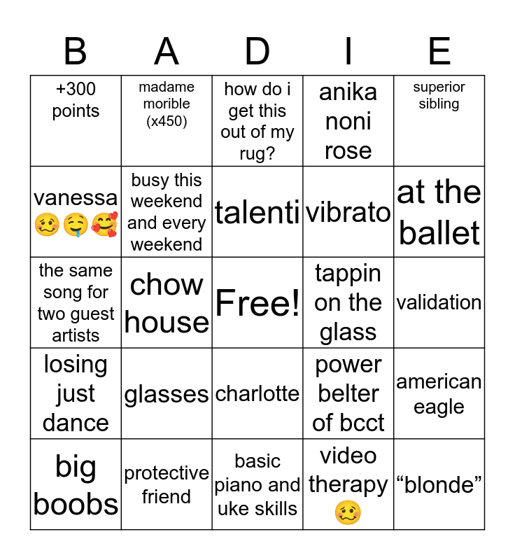 This bingo card has a free space and 24 words: glasses, protective friend, talenti, big boobs, superior sibling, +300 points, vanessa🥴🤤🥰, madame morible (x450), tappin on the glass, charlotte, vibrato, the same song for two guest artists, power belter of bcct, american eagle, busy this weekend and every weekend, video therapy🥴, validation, how do i get this out of my rug?, at the ballet, chow house, “blonde”, losing just dance, anika noni rose and basic piano and uke skills.