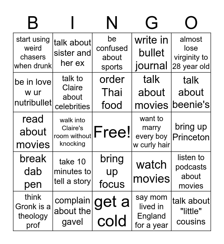 This bingo card has a free space and 24 words: take 10 minutes to tell a story, complain about the gavel, order Thai food, think Gronk is a theology prof, almost lose virginity to 28 year old, start using weird chasers when drunk, be in love w ur nutribullet, talk about sister and her ex, want to marry every boy w curly hair, bring up focus, talk about movies, read about movies, watch movies, listen to podcasts about movies, talk to Claire about celebrities, say mom lived in England for a year, bring up Princeton, be confused about sports, talk about beenie's, walk into Claire's room without knocking, talk about "little" cousins, break dab pen, write in bullet journal and get a cold.
