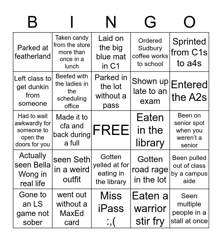 This bingo card has a free space and 24 words: seen Seth in a weird outfit, went out without a MaxEd card, Parked in the lot without a pass, Gone to an LS game not sober, Sprinted from C1s to a4s, Parked at featherland, Left class to get dunkin from someone, Taken candy from the store more than once in a lunch, Eaten in the library, Gotten yelled at for eating in the library, Shown up late to an exam, Had to wait awkwardly for someone to open the doors for you, Gotten road rage in the lot, Been pulled out of class by a campus aide, Beefed with the ladies in the scheduling office, Eaten a warrior stir fry, Been on senior spot when you weren’t a senior, Laid on the big blue mat in C1, Entered the A2s, Made it to cfa and back during a full, Seen multiple people in a stall at once, Actually seen Bella Wong in real life, Ordered Sudbury coffee works to school and Miss iPass :,(.