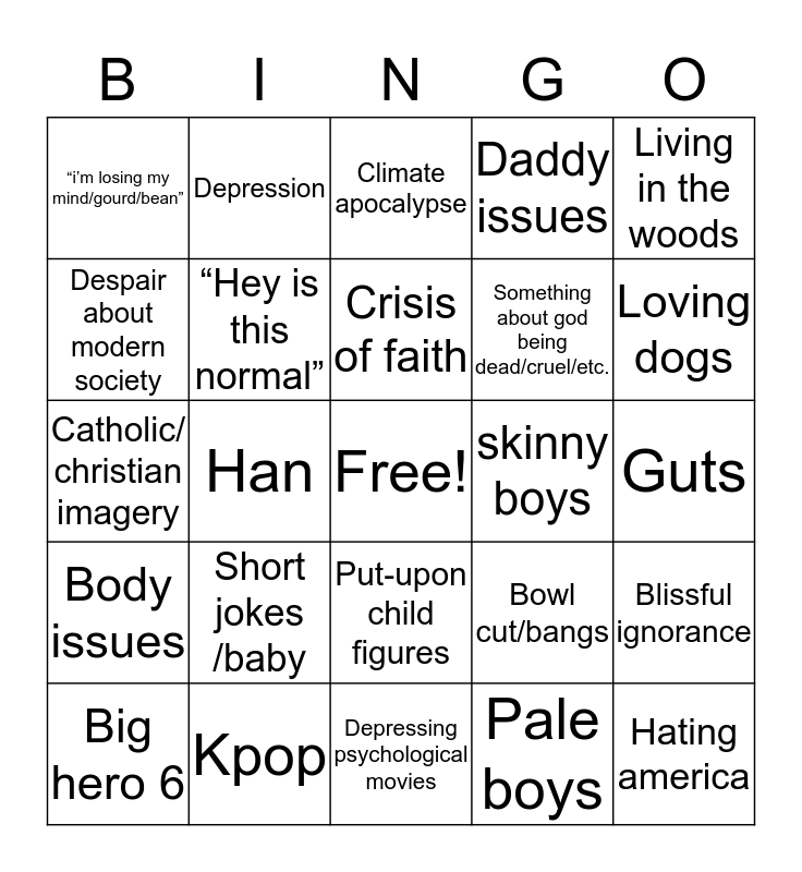 This bingo card has a free space and 24 words: Short jokes /baby, Kpop, Crisis of faith, Big hero 6, Living in the woods, “i’m losing my mind/gourd/bean”, Despair about modern society, Depression, skinny boys, Put-upon child figures, Something about god being dead/cruel/etc., Catholic/ christian imagery, Bowl cut/bangs, Blissful ignorance, “Hey is this normal”, Pale boys, Guts, Climate apocalypse, Loving dogs, Han, Hating america, Body issues, Daddy issues and Depressing psychological movies.