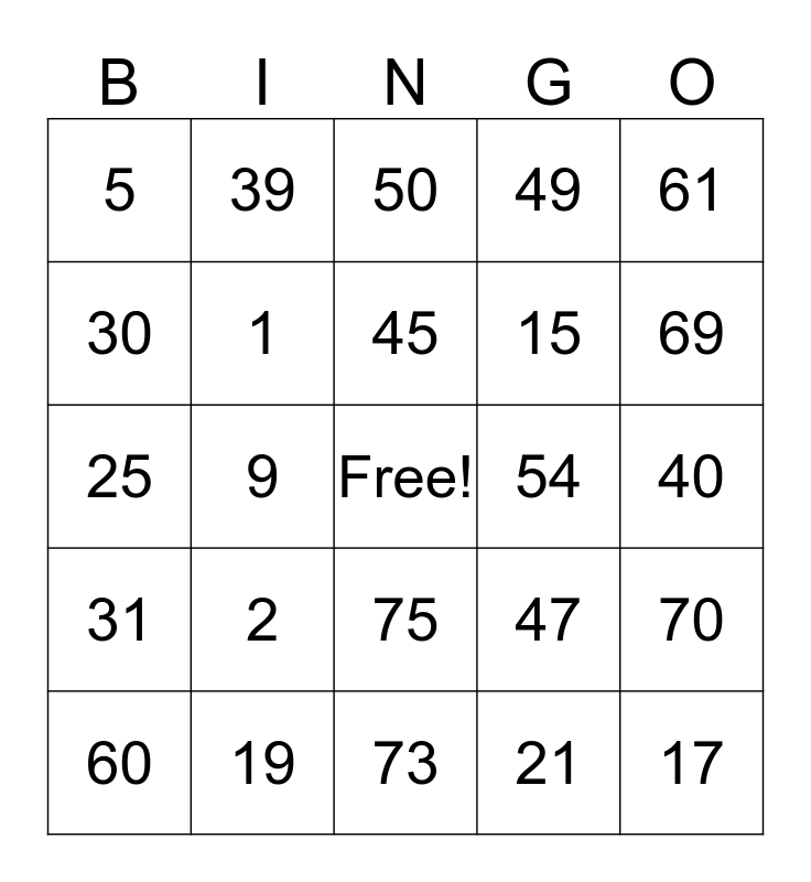 This bingo card has a free space and 24 words: 2, 19, 45, 60, 61, 5, 30, 39, 54, 75, 15, 25, 47, 70, 1, 21, 40, 50, 69, 9, 17, 31, 49 and 73.