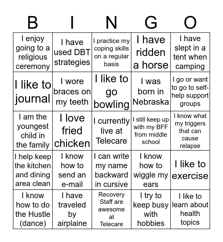 This bingo card has a free space and 24 words: I know how to send an e-mail, I have traveled by airplaine, I like to go bowling, I know how to do the Hustle (dance), I have slept in a tent when camping, I enjoy going to a religious ceremony, I like to journal, I have used DBT strategies, I still keep up with my BFF from middle school, I can write my name backward in cursive, I was born in Nebraska, I am the youngest child in the family, I know how to wiggle my ears, I like to exercise, I wore braces on my teeth, I try to keep busy with hobbies, I know what my triggers that can cause relapse, I practice my coping skills on a regular basis, I go or want to go to self-help support groups, I love fried chicken, I like to learn about health topics, I help keep the kitchen and dining area clean, I have ridden a horse and Recovery Staff are awesome at Telecare.