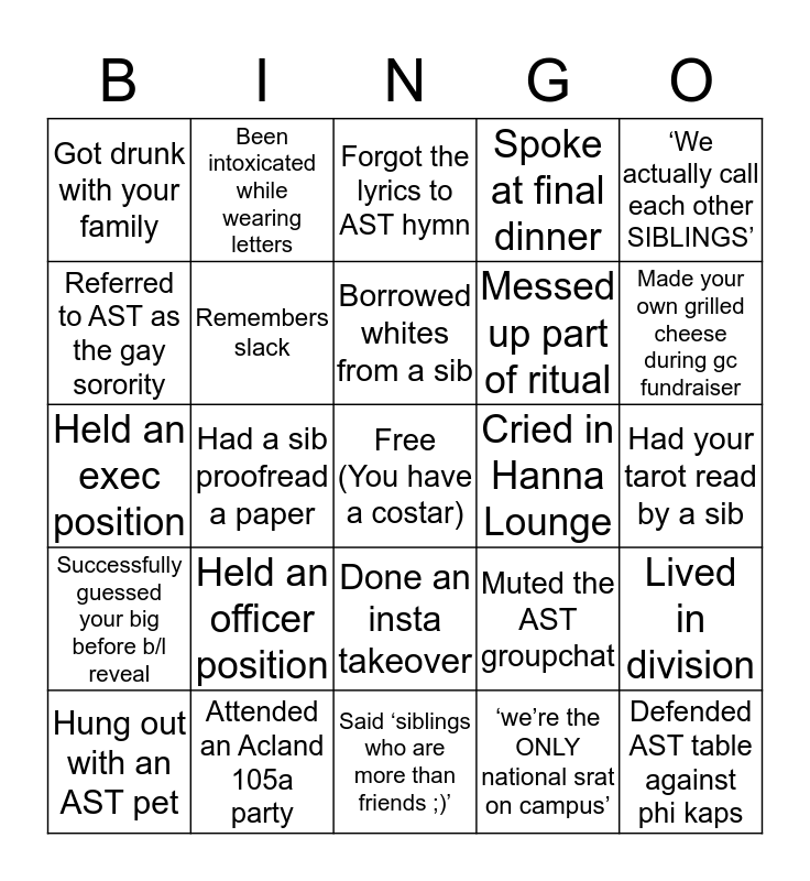 This bingo card has a free space and 24 words: Held an officer position, Attended an Acland 105a party, Borrowed whites from a sib, Hung out with an AST pet, ‘We actually call each other SIBLINGS’, Got drunk with your family, Referred to AST as the gay sorority, Been intoxicated while wearing letters, Cried in Hanna Lounge, Done an insta takeover, Messed up part of ritual, Held an exec position, Muted the AST groupchat, Lived in division, Remembers slack, ‘we’re the ONLY national srat on campus’, Had your tarot read by a sib, Forgot the lyrics to AST hymn, Made your own grilled cheese during gc fundraiser, Had a sib proofread a paper, Defended AST table against phi kaps, Successfully guessed your big before b/l reveal, Spoke at final dinner and Said ‘siblings who are more than friends ;)’.