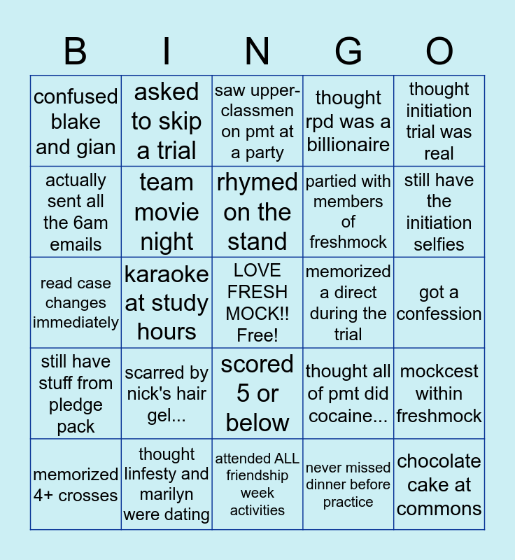 This bingo card has a free space and 24 words: scarred by nick's hair gel..., thought linfesty and marilyn were dating, rhymed on the stand, memorized 4+ crosses, thought initiation trial was real, confused blake and gian, actually sent all the 6am emails, asked to skip a trial, memorized a direct during the trial, scored 5 or below, partied with members of freshmock, read case changes immediately, thought all of pmt did cocaine..., mockcest within freshmock, team movie night, never missed dinner before practice, got a confession, saw upper- classmen on pmt at a party, still have the initiation selfies, karaoke at study hours, chocolate cake at commons, still have stuff from pledge pack, thought rpd was a billionaire and attended ALL friendship week activities.