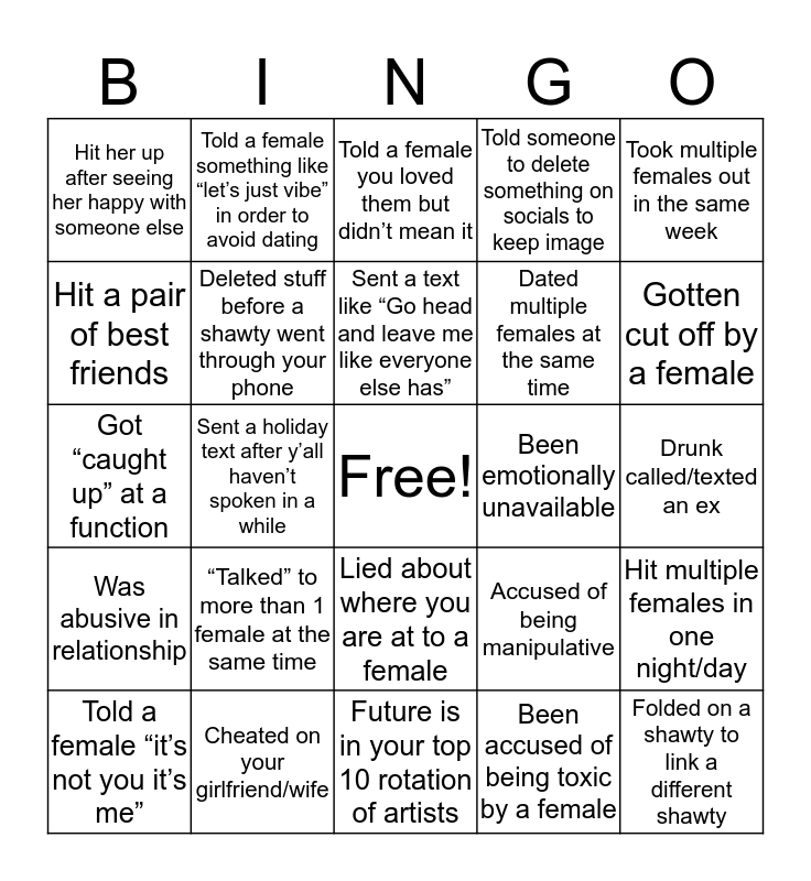 This bingo card has a free space and 24 words: “Talked” to more than 1 female at the same time, Cheated on your girlfriend/wife, Sent a text like “Go head and leave me like everyone else has”, Told a female “it’s not you it’s me”, Took multiple females out in the same week, Hit her up after seeing her happy with someone else, Hit a pair of best friends, Told a female something like “let’s just vibe” in order to avoid dating, Been emotionally unavailable, Lied about where you are at to a female, Dated multiple females at the same time, Got “caught up” at a function, Accused of being manipulative, Hit multiple females in one night/day, Deleted stuff before a shawty went through your phone, Been accused of being toxic by a female, Drunk called/texted an ex, Told a female you loved them but didn’t mean it, Gotten cut off by a female, Sent a holiday text after y’all haven’t spoken in a while, Folded on a shawty to link a different shawty, Was abusive in relationship, Told someone to delete something on socials to keep image and Future is in your top 10 rotation of artists.