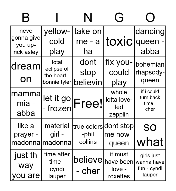 This bingo card has a free space and 30 words: time after time - cyndi lauper, down under - men at work, let it go - frozen, this love- maroon 5, neve gonna give you up- rick asley, take on me - a ha, total eclipse of the heart - bonnie tyler, true colors -phil collins, whole lotta love- led zepplin, believe - cher, if i could turn back time - cher, girls just wanna have fun - cyndi lauper, it must have been love -roxettes, hungery like a wolf - duran duran, bohemian rhapsody-queen, go your own way-fleetwood mac, dont stop me now - queen, like a prayer - madonna, material girl - madonna, dancing queen -abba, mamma mia - abba, i should be so lucky- kylie minoque, yellow-cold play, fix you- could play, dream on, toxic, so what, just th way you are, dont stop believin and just the wat you are - druno mars.