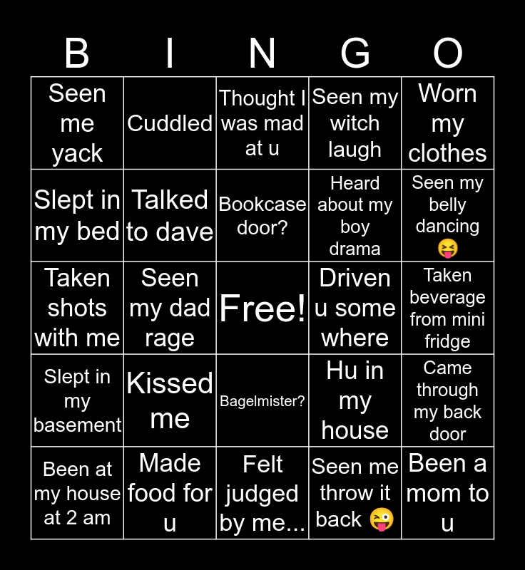 This bingo card has a free space and 24 words: Kissed me, Made food for u, Bookcase door?, Been at my house at 2 am, Worn my clothes, Seen me yack, Slept in my bed, Cuddled, Driven u some where, Bagelmister?, Heard about my boy drama, Taken shots with me, Hu in my house, Came through my back door, Talked to dave, Seen me throw it back 😜, Taken beverage from mini fridge, Thought I was mad at u, Seen my belly dancing 😝, Seen my dad rage, Been a mom to u, Slept in my basement, Seen my witch laugh and Felt judged by me....