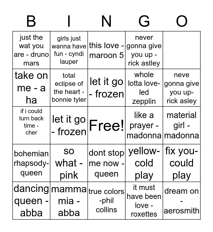 This bingo card has a free space and 31 words: time after time - cyndi lauper, down under - men at work, let it go - frozen, this love- maroon 5, neve gonna give you up- rick asley, take on me - a ha, total eclipse of the heart - bonnie tyler, true colors -phil collins, whole lotta love- led zepplin, believe - cher, if i could turn back time - cher, girls just wanna have fun - cyndi lauper, it must have been love -roxettes, hungery like a wolf - duran duran, bohemian rhapsody-queen, go your own way-fleetwood mac, dont stop me now - queen, like a prayer - madonna, material girl - madonna, dancing queen -abba, mamma mia - abba, i should be so lucky- kylie minoque, yellow-cold play, fix you- could play, just the wat you are - druno mars, let it go - frozen, this love - maroon 5, never gonna give you up - rick astley, dream on - aerosmith, toxic - britney spears and so what - pink.