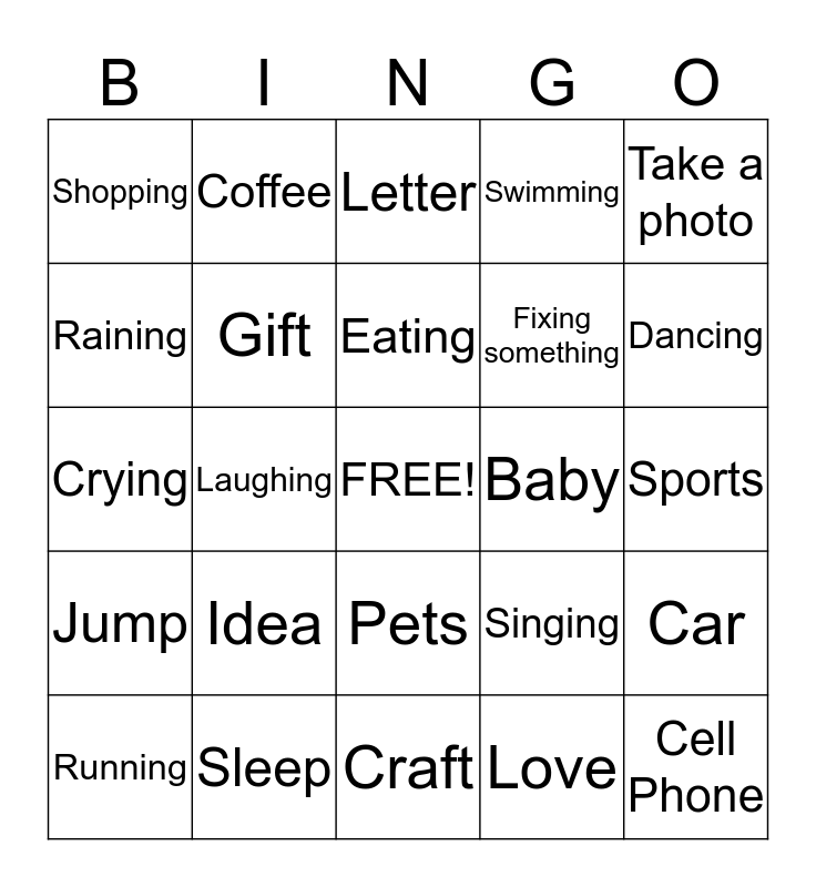 This bingo card has a free space and 24 words: Idea, Sleep, Eating, Running, Take a photo, Shopping, Raining, Coffee, Baby, Pets, Fixing something, Crying, Singing, Car, Gift, Love, Sports, Letter, Dancing, Laughing, Cell Phone, Jump, Swimming and Craft.