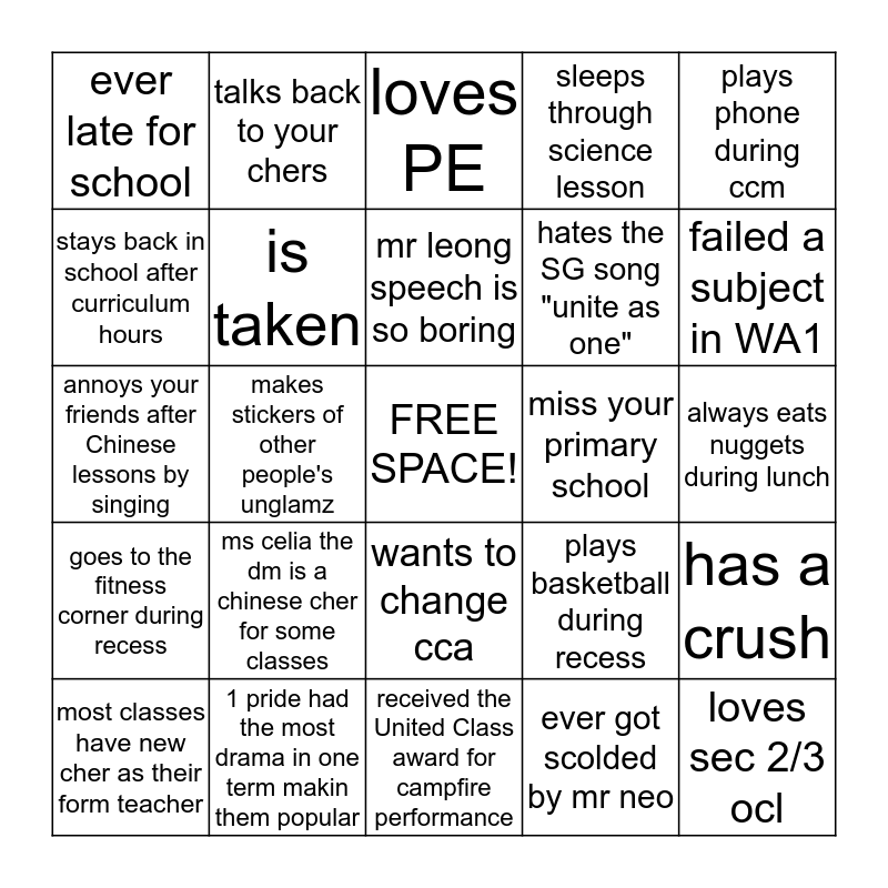 This bingo card has a free space and 24 words: ms celia the dm is a chinese cher for some classes, 1 pride had the most drama in one term makin them popular, mr leong speech is so boring, most classes have new cher as their form teacher, plays phone during ccm, ever late for school, stays back in school after curriculum hours, talks back to your chers, miss your primary school, wants to change cca, hates the SG song "unite as one", annoys your friends after Chinese lessons by singing, plays basketball during recess, has a crush, is taken, ever got scolded by mr neo, always eats nuggets during lunch, loves PE, failed a subject in WA1, makes stickers of other people's unglamz, loves sec 2/3 ocl, goes to the fitness corner during recess, sleeps through science lesson and received the United Class award for campfire performance.