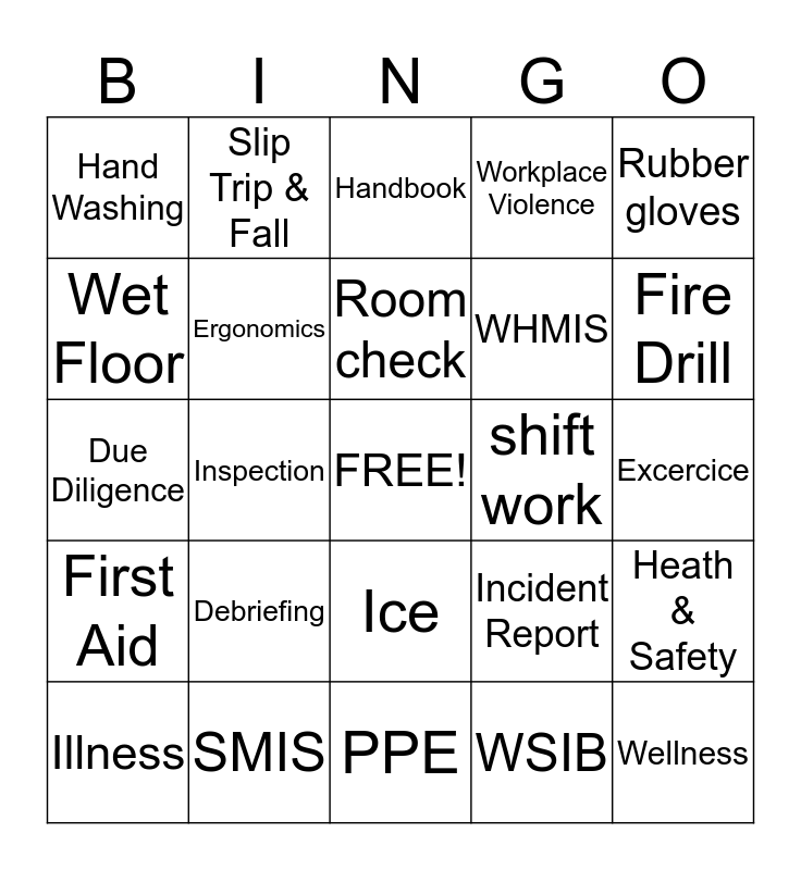 This bingo card has a free space and 24 words: Debriefing, SMIS, Room check, Illness, Rubber gloves, Hand Washing, Wet Floor, Slip Trip & Fall, shift work, Ice, WHMIS, Due Diligence, Incident Report, Heath & Safety, Ergonomics, WSIB, Excercice, Handbook, Fire Drill, Inspection, Wellness, First Aid, Workplace Violence and PPE.