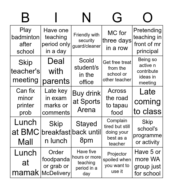 This bingo card has 25 words: Skip breakfast n lunch, Have five hours or more teaching period in a day, Scold student/s in the office, Lunch at mamak, Pretending teaching in front of mr principal, Play badminton after school, Skip teacher's meeting, Have one teaching period only in a day, Across the road to tapau food, Stayed back until 8pm, Get free treat from the school or other teacher, Can fix minor printer prob, Complain tired but still doing your best as a teacher, Skip school's programme or activity, Deal with parents, Have 5 or more WA group just for school, Late coming to class, Friendly with security guard/cleaner, Being so active n contribute ideas in meeting, Late key in exam marks or comments, Buy drink at Sports Arena, Order foodpanda or grab or McDelivery, Lunch at BMC Mall, MC for three days in a row and Projector spoiled when you want to use it.
