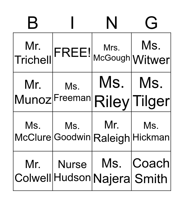 This bingo card has 19 words: Mr. Raleigh, Mr. Salas, Mrs. McGough, Coach Smith, Ms. Hickman, Mr. Munoz, Ms. Najera, Mr. Trichell, FREE!, Ms. McClure, Ms. Goodwin, Ms. Freeman, Ms. Riley, Nurse Hudson, Mr. Colwell, Mrs. Rajama, Ms. Witwer, Ms. Tilger and Ms. Hilma.
