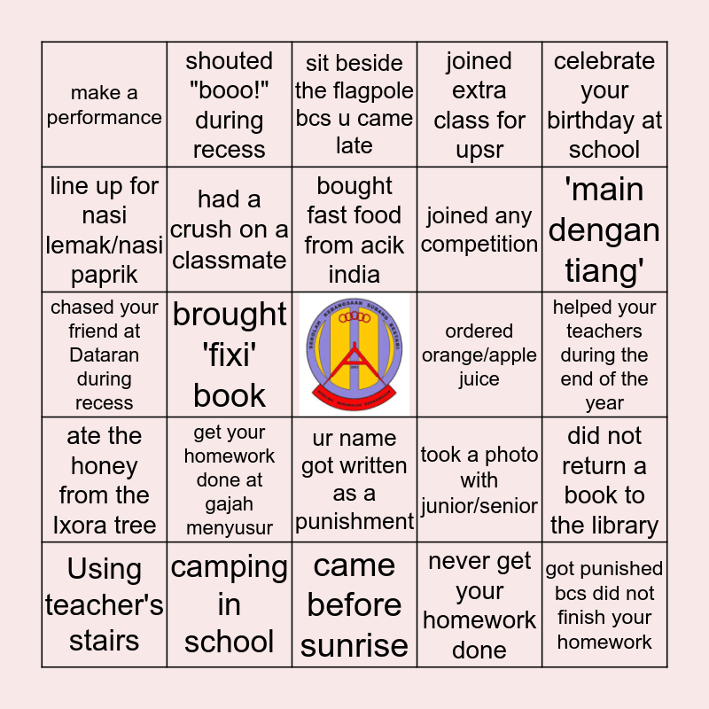 This bingo card has a free space and 24 words: get your homework done at gajah menyusur, camping in school, bought fast food from acik india, Using teacher's stairs, celebrate your birthday at school, make a performance, line up for nasi lemak/nasi paprik, shouted "booo!" during recess, ordered orange/apple juice, ur name got written as a punishment, joined any competition, chased your friend at Dataran during recess, took a photo with junior/senior, did not return a book to the library, had a crush on a classmate, never get your homework done, helped your teachers during the end of the year, sit beside the flagpole bcs u came late, 'main dengan tiang', brought 'fixi' book, got punished bcs did not finish your homework, ate the honey from the Ixora tree, joined extra class for upsr and came before sunrise.