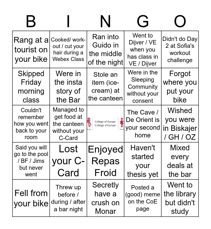 This bingo card has a free space and 24 words: Lost your C-Card, Threw up before / during / after a bar night, Stole an item (ice-cream) at the canteen, Fell from your bike, Didn't do Day 2 at Sofia's workout challenge, Rang at a tourist on your bike, Skipped Friday morning class, Cooked/ work-out / cut your hair during a Webex Class, The Cave / De Orient is your second home, Enjoyed Repas Froid, Were in the Sleeping Community without your consent, Couldn't remember how you went back to your room, Haven't started your thesis yet, Mixed every deals at the bar, Were in the insta story of the Bar, Posted a (good) meme on the CoE page, Wished you were in Biskajer / GH / OZ, Ran into Guido in the middle of the night, Forgot where you put your bike, Managed to get food at the canteen without your C-Card, Went to the library but didn't study, Said you will go to the pool / BF / Jims but never went, Went to Dijver / VE when you has class in VE / Dijver and Secretly have a crush on Monar.