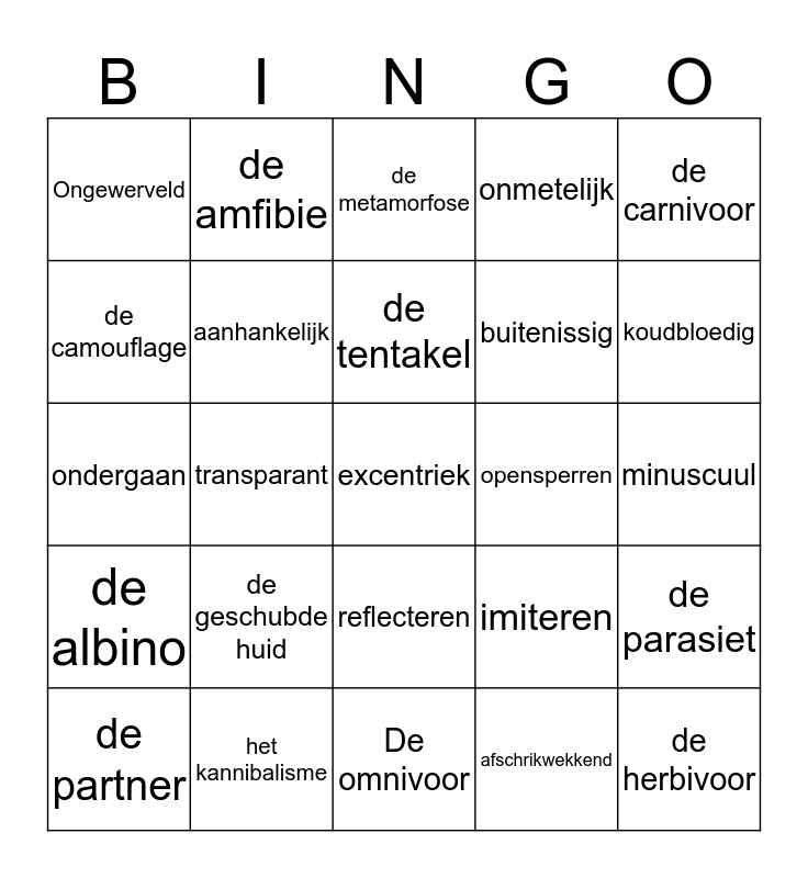 This bingo card has 30 words: het kannibalisme, de wervelkolom, transparant, het pantser, Ongewerveld, de metamorfose, aanhankelijk, reflecteren, opensperren, De omnivoor, minuscuul, excentriek, afschrikwekkend, de herbivoor, koudbloedig, naïef, imiteren, de albino, de geschubde huid, de carnivoor, ondergaan, imponeren, de amfibie, buitenissig, de camouflage, onmetelijk, de parasiet, de partner, de tentakel and uitzonderlijk.