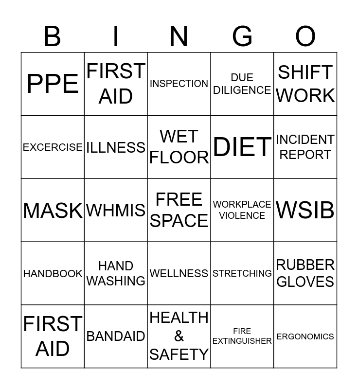 This bingo card has a free space and 37 words: DEBRIEFING, SMIS, ROOM CHECK, ILLNESS, RUBBER GLOVES, HAND WASHING, WET FLOOR, SLIP TRIP & FALL, SHIFT WORK, ICE, WHMIS, DUE DILIGENCE, ERGONOMICS, WSIB, EXCERCISE, HANDBOOK, FIRE DRILL, INSPECTION, WELLNESS, WORKPLACE VIOLENCE, PPE, INCIDENT REPORT, FIRST AID, HEALTH & SAFETY, RISK, FIRE EXTINGUISHER, FIRST AID, FLASH LIGHT, WALKIE-TALKIE, RADIO, EMERGENCY BAG, BANDAID, MASK, RELAXATION, STRETCHING, DIET and SLEEP.