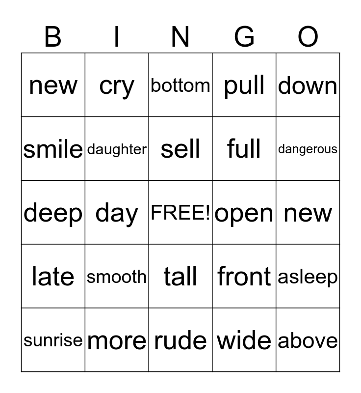 This bingo card has a free space and 24 words: smooth, more, sell, sunrise, down, new, smile, cry, open, tall, full, deep, front, asleep, daughter, wide, new, bottom, dangerous, day, above, late, pull and rude.