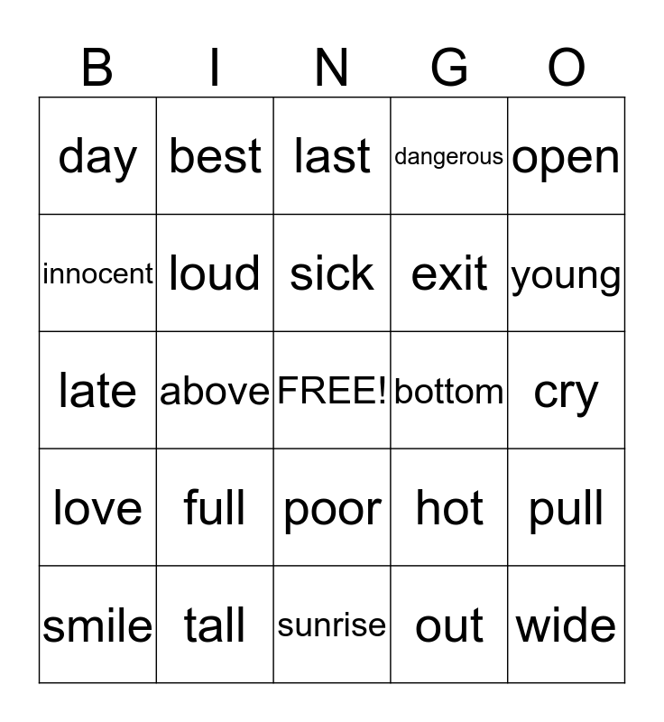This bingo card has a free space and 24 words: full, tall, sick, smile, open, day, innocent, best, bottom, poor, exit, late, hot, pull, loud, out, cry, last, young, above, wide, love, dangerous and sunrise.