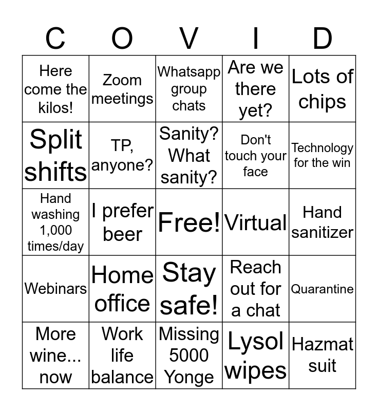 This bingo card has a free space and 24 words: Home office, Work life balance, Sanity? What sanity?, More wine... now, Lots of chips, Here come the kilos!, Split shifts, Zoom meetings, Virtual, Stay safe!, Don't touch your face, Hand washing 1,000 times/day, Reach out for a chat, Quarantine, TP, anyone?, Lysol wipes, Hand sanitizer, Whatsapp group chats, Technology for the win, I prefer beer, Hazmat suit, Webinars, Are we there yet? and Missing 5000 Yonge.