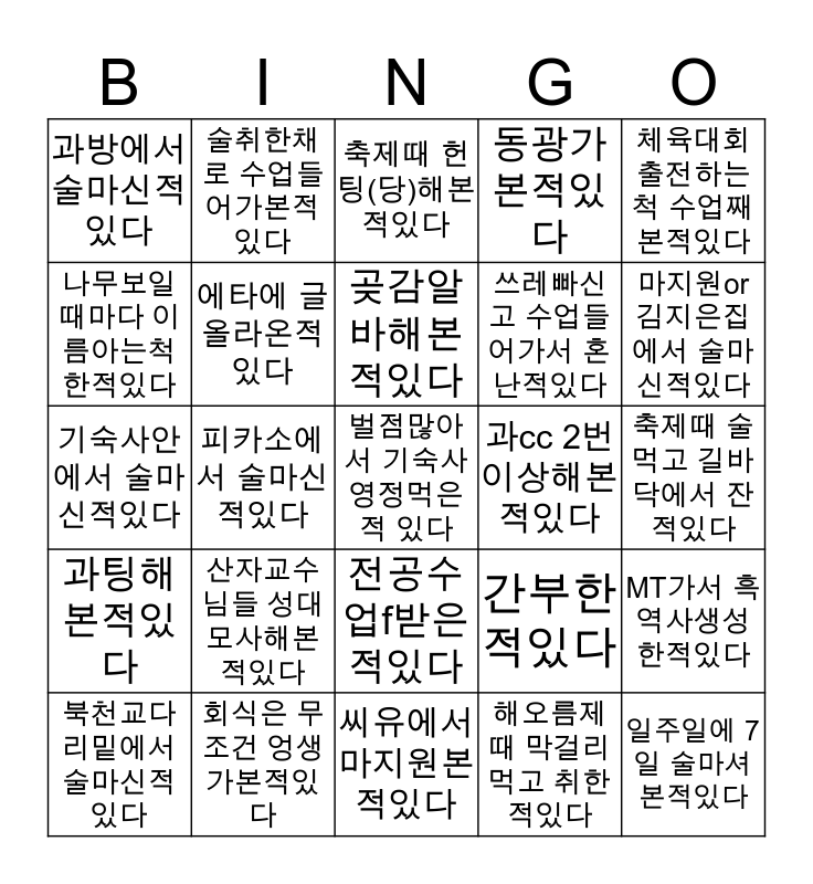 This bingo card has a free space and 24 words: 산자교수님들 성대모사해본적있다, 회식은 무조건 엉생가본적있다, 곶감알바해본적있다, 북천교다리밑에서술마신적있다, 체육대회출전하는척 수업째본적있다, 과방에서 술마신적있다, 나무보일때마다 이름아는척 한적있다, 술취한채로 수업들어가본적있다, 과cc 2번이상해본적있다, 전공수업f받은적있다, 쓰레빠신고 수업들어가서 혼난적있다, 기숙사안에서 술마신적있다, 간부한적있다, MT가서 흑역사생성한적있다, 에타에 글올라온적있다, 해오름제때 막걸리먹고 취한적있다, 축제때 술먹고 길바닥에서 잔적있다, 축제때 헌팅(당)해본적있다, 마지원or김지은집에서 술마신적있다, 피카소에서 술마신적있다, 일주일에 7일 술마셔본적있다, 과팅해본적있다, 동광가본적있다 and 씨유에서 마지원본적있다.