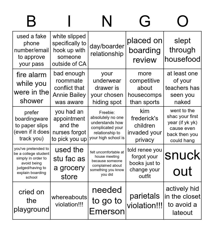 This bingo card has a free space and 24 words: cried on the playground, used the stu fac as a grocery store, your underwear drawer is your chosen hiding spot, parietals violation!!!, slept through housefood, used a fake phone number/email to approve your pass, white slipped specifically to hook up with someone outside of CA, day/boarder relationship, kim frederick's children invaded your privacy, went to the shac your first year (if yk yk) cause even back then you could hang, prefer boardingware to paper slips (even if it does track you), bad enough roommate conflict that Annie Bailey was aware, told renee you forgot your books just to change your outfit, snuck out, fire alarm while you were in the shower, whereabouts violation!!!, needed to go to Emerson, placed on boarding review, at least one of your teachers has seen you naked, you've pretended to be a college student simply in order to avoid being judged/having to explain boarding school, you had an appointment and the nurses forgot to pick you up, felt uncomfortable at house meeting because someone complained about something you know you did, more competitive about housecomps than sports and actively hid in the closet to avoid a lateout.