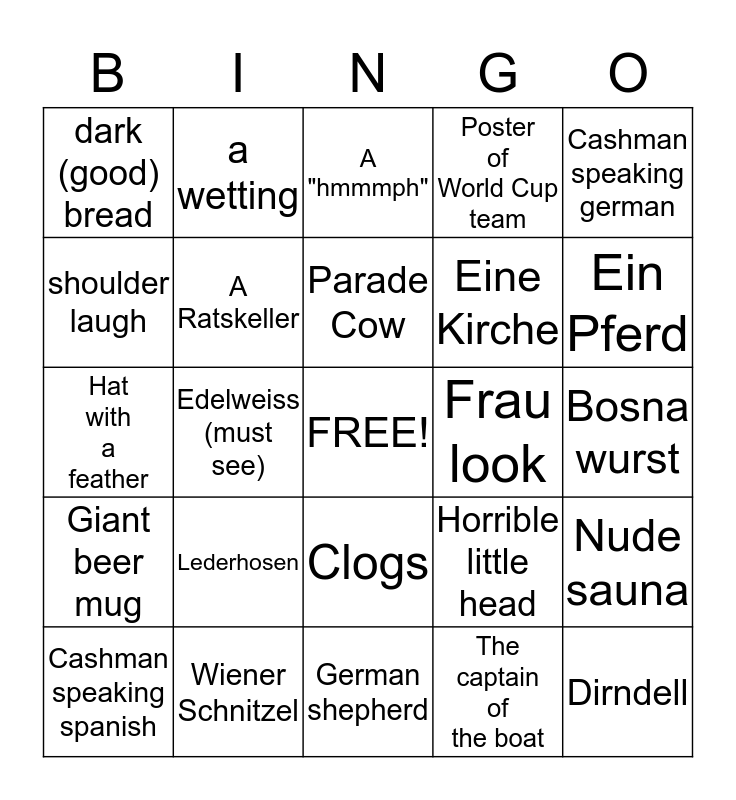 This bingo card has a free space and 24 words: Lederhosen, Wiener Schnitzel, Parade Cow, Cashman speaking spanish, Cashman speaking german, dark (good) bread, shoulder laugh, a wetting, Frau look, Clogs, Eine Kirche, Hat with a feather, Horrible little head, Nude sauna, A Ratskeller, The captain of the boat, Bosna wurst, A "hmmmph", Ein Pferd, Edelweiss (must see), Dirndell, Giant beer mug, Poster of World Cup team and German shepherd.