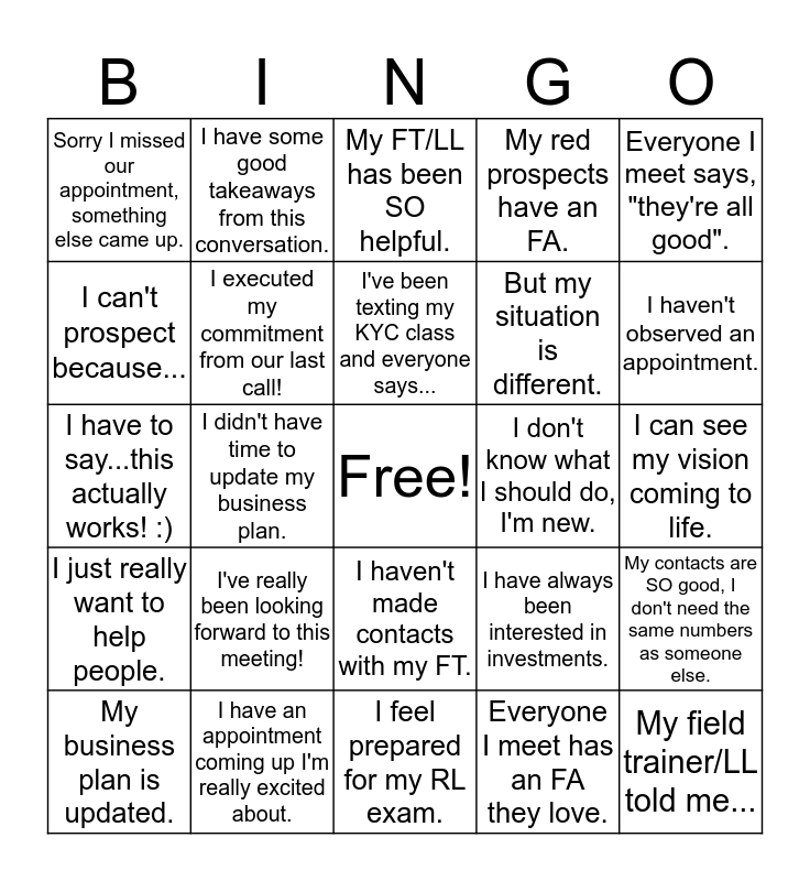 This bingo card has a free space and 24 words: I've really been looking forward to this meeting!, I have an appointment coming up I'm really excited about., I've been texting my KYC class and everyone says..., My business plan is updated., Everyone I meet says, "they're all good"., Sorry I missed our appointment, something else came up., I can't prospect because..., I have some good takeaways from this conversation., I don't know what I should do, I'm new., I haven't made contacts with my FT., But my situation is different., I have to say...this actually works! :), I have always been interested in investments., My contacts are SO good, I don't need the same numbers as someone else., I executed my commitment from our last call!, Everyone I meet has an FA they love., I can see my vision coming to life., My FT/LL has been SO helpful., I haven't observed an appointment., I didn't have time to update my business plan., My field trainer/LL told me..., I just really want to help people., My red prospects have an FA. and I feel prepared for my RL exam..