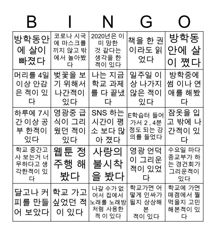 This bingo card has a free space and 24 words: 웹툰 정주행 해봤다, 학교 가고싶었던 적이 있다, 나는 지금학교 과제를 다 끝냈다, 달고나 커피를 만들어 보았다, 방학동안에 살이 쪘다, 방학동안에 살이 빠졌다, 머리를 4일 이상 안감은 적이 있다, 코로나 시국에 마스크를 끼지 않고 밖에서 놀아봤다, E학습터 들어가서 2 , 4분 정도 되는 강의를 들었다, 사랑의 불시착을 봤다, 일주일 이상 나가지 않은 적이 있다, 하루에 7시간 이상 공부 한적이 있다, 영광 언덕이 그리운 적이 있었다, 수요일 마다 종교부가 하는 경건회가 그리운적이 있다, 벚꽃을 보기 위해서 나간적이 있다, 학교가면 어떻게 인싸가 될지 상상해 본 적이 있다, 잠옷을 입고 밖에 나간적이 있다, 2020년은 이미 망한것 같다는 생각을 한적이 있다, 방학중에 썸 이나 연애를 해봤다, 영광중 급식이 그리웠던 적이 있다, 학교에 가면 매점에서 뭘 먹을지 고민해본적이 있다, 학교 중간고사 보는거 너무하다고 생각한적이 있다, 책을 한 권 이라도 읽었다 and 나갈 수가 없어서 집에서 노래를 노래방처럼 사용한 적 이 있다.