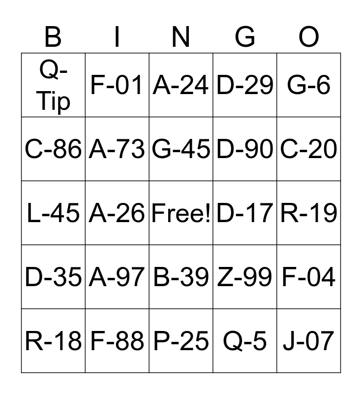 This bingo card has a free space and 50 words: L-32, J-07, D-10, P-25, A-97, R-99, F-01, B-02, C-86, D-75, A-73, D-29, F-04, Z-99, Z-92, B-22, G-45, D-17, R-11, G-6, A-26, Q-5, Q-Tip, D-90, F-43, J-37, C-20, D-81, A-24, B-39, B-27, H-17, K-16, K-0, F-88, A-1, A-77, B-66, P-99, R-19, D-12, A-07, B-09, G-78, R-18, L-45, I-69, I-34, D-35 and P-05.