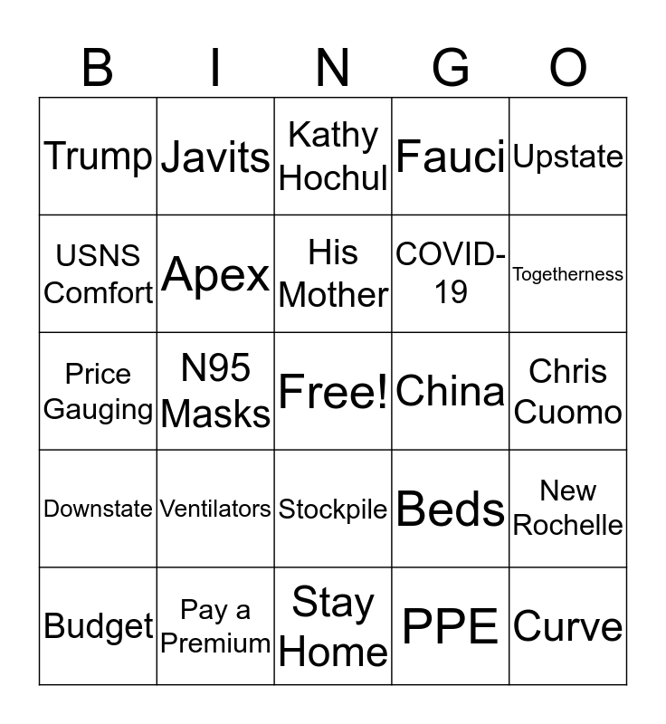 This bingo card has a free space and 24 words: Ventilators, Pay a Premium, His Mother, Budget, Upstate, Trump, USNS Comfort, Javits, China, Stockpile, COVID-19, Price Gauging, Beds, New Rochelle, Apex, PPE, Chris Cuomo, Kathy Hochul, Togetherness, N95 Masks, Curve, Downstate, Fauci and Stay Home.