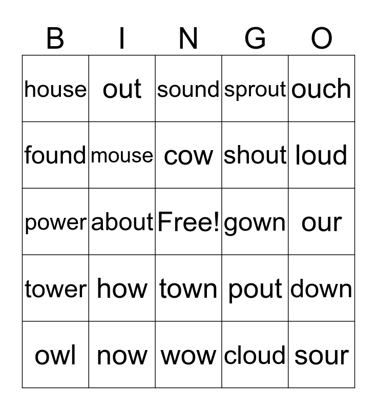 This bingo card has a free space and 24 words: how, now, cow, owl, ouch, house, found, out, gown, town, shout, power, pout, down, mouse, cloud, our, sound, loud, about, sour, tower, sprout and wow.