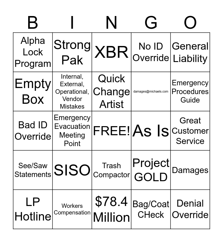 This bingo card has a free space and 25 words: SISO, $78.4 Million, Quick Change Artist, LP Hotline, General Liability, Alpha Lock Program, Empty Box, Strong Pak, As Is, Trash Compactor, damages@michaels.com, Bad ID Override, Project GOLD, Damages, Internal, External, Operational, Vendor Mistakes, LISA BOB LUL, Great Customer Service, XBR, Emergency Procedures Guide, Emergency Evacuation Meeting Point, Denial Override, Workers Compensation, See/Saw Statements, No ID Override and Bag/Coat CHeck.