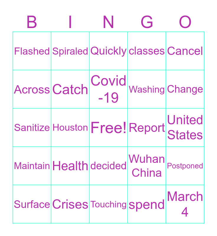 This bingo card has a free space and 24 words: Health, Crises, Covid -19, Surface, Cancel, Flashed, Across, Spiraled, Report, decided, Washing, Sanitize, Wuhan China, Postponed, Catch, spend, United States, Quickly, Change, Houston, March 4, Maintain, classes and Touching.