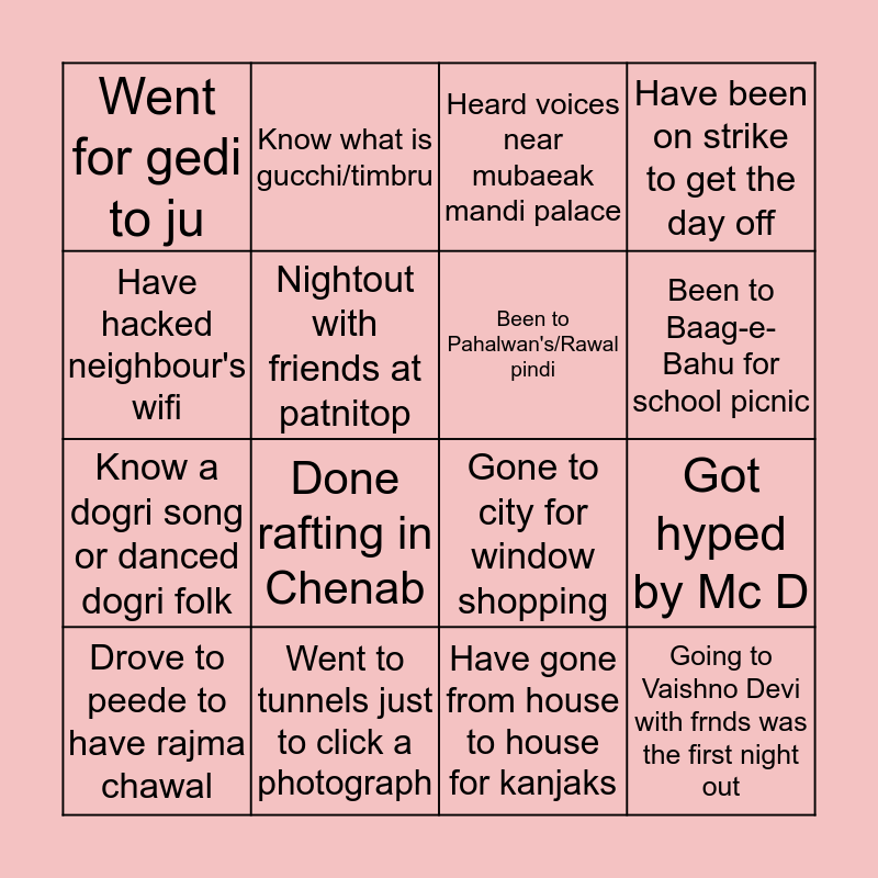 This bingo card has 16 words: Went to tunnels just to click a photograph, Got hyped by Mc D, Heard voices near mubaeak mandi palace, Went for gedi to ju, Know a dogri song or danced dogri folk, Know what is gucchi/timbru, Gone to city for window shopping, Have gone from house to house for kanjaks, Have hacked neighbour's wifi, Nightout with friends at patnitop, Drove to peede to have rajma chawal, Have been on strike to get the day off, Done rafting in Chenab, Been to Baag-e-Bahu for school picnic, Been to Pahalwan's/Rawal pindi and Going to Vaishno Devi with frnds was the first night out.