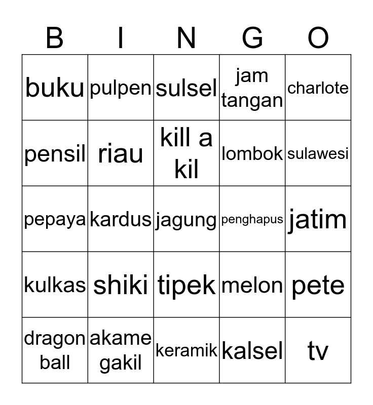 This bingo card has a free space and 24 words: shiki, akame gakil, kill a kil, dragon ball, charlote, buku, pensil, pulpen, penghapus, tipek, lombok, pepaya, melon, pete, riau, kalsel, jatim, sulsel, sulawesi, kardus, tv, kulkas, jam tangan and keramik.