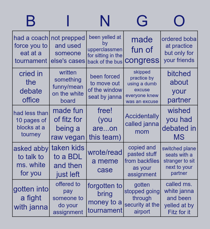 This bingo card has a free space and 59 words: been scared of janna, offered to pay someone to do your assignment, kicked a teammate, asked abby to talk to ms. white for you, gotten stopped going through security at the airport, been confused by inside jokes, written something funny/mean on the white board, quit/threatened to quit, skipped practice by using a dumb excuse everyone knew was an excuse, prayed to the almighty ceiling giulio, made fun of congress, felt neglected by coaches :(, cried in the debate office, Had Janna tell you you were going to break/bid/win and that just so not happening, had a partner change mid-year, had a coach force you to eat at a tournament, called ms. white janna and been yelled at by Fitz for it, ordered boba at practice but only for your friends, called a coach after 10PM, been forced to move out of the window seat by janna, Accidentally called janna mom, been yelled at by upperclassmen for sitting in the back of the bus, gotten into a fight with janna, switched plane seats with a stranger to sit next to your partner, lost/left your luggage somewhere in the airport, lost/broken your laptop, stolen someone's charger, gone on an angry walk, bitched about your partner, asked what the res was on the way to a tournament, been on polypf, begged for the polypf pw, seen janna on one of her "walks", not gotten to go to a tournament you wanted to go to, not prepped and used someone else's cases, been flamed on the reddit/discord, been hyped up on the reddit/discord, made fun of fitz for being a raw vegan, called janna whitey or mrs. mold to her face, had less than 10 pages of blocks at a tourney, been forced to go to a local, taken kids to a BDL and then just left, wished you had debated in MS, debated in MS, stolen candy from janna's desk, been mad at fitz for being a hardass, thrown water on someone, bailed on going to a tournament less than a week before, wrote/read a meme case, forgotten to bring money to a tournament, switched hotel rooms with someone without permission, forgot/didn't bring enough debate clothes, needed someone to bring you toothpaste at an odd hour, been yelled at by a custodian for being in a room for practice, written a case on the bus/plane, copied and pasted stuff from backfiles as your assignment, hated the assignment system, fought with a teammate over success and had coaches argue about cases for an entire prep call while you sit there awkwardly.