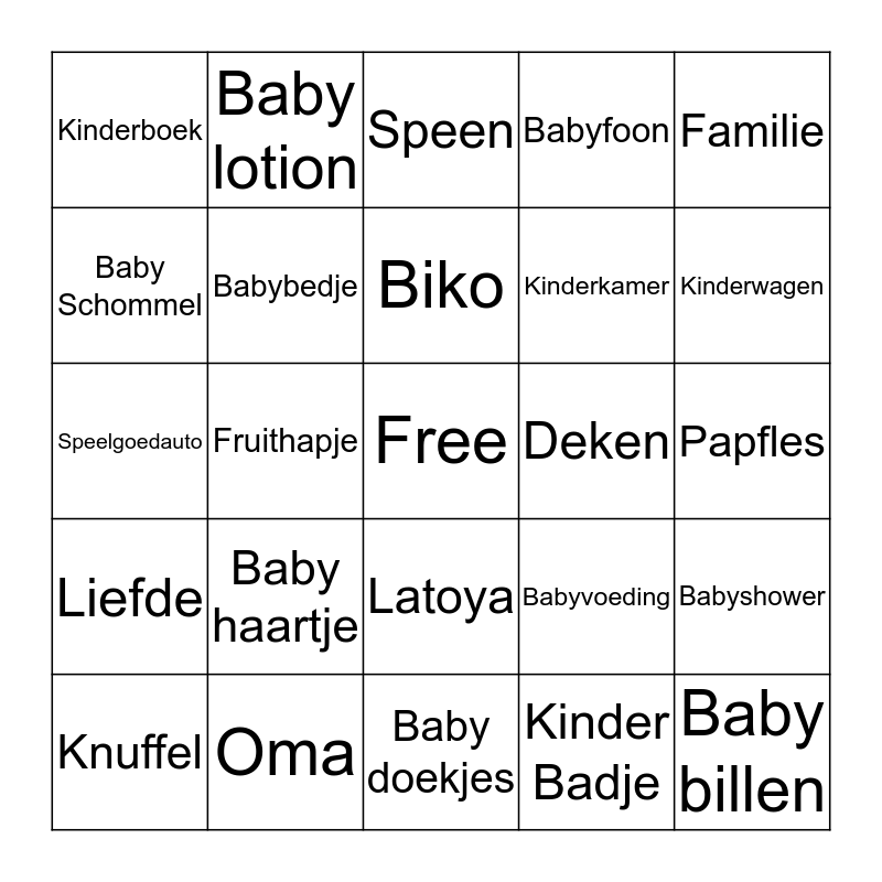 This bingo card has a free space and 49 words: Baby, Baby billen, Baby boek, Baby doekjes, Baby haartje, Baby kleertjes, Baby lotion, Baby olie, Baby Schommel, Baby sokjes, Babybedje, Babyfoon, Babyshower, Babyvoeding, Bad eendje, Bijtring, Biko, Deken, Dutje, Familie, Fruithapje, Kinder Badje, Kinderboek, Kinderkamer, Kinderstoel, Kinderwagen, Knuffel, Knuffelbeer, Latoya, Liefde, Luier, Luiertas, Mama, Melk, Oma, Oom, Opa, Papa, Papfles, Rammellaar, Romper, Slaapliedjes, Slabber, Speelgoed, Speelgoedauto, Speen, Tante, Veiligheidsspeld and Zwangerschap.