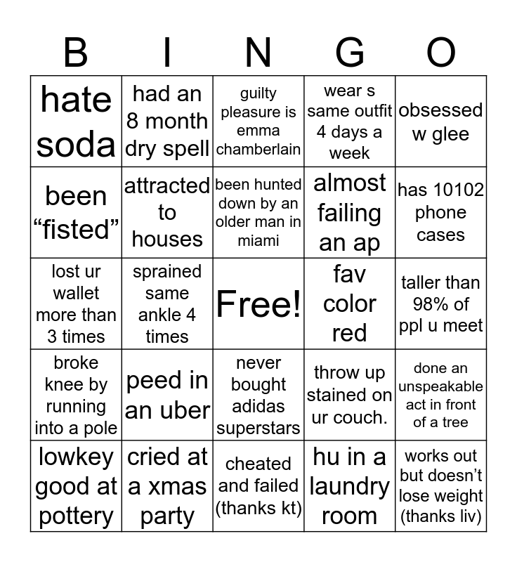 This bingo card has a free space and 24 words: peed in an uber, cried at a xmas party, been hunted down by an older man in miami, lowkey good at pottery, obsessed w glee, hate soda, been “fisted”, had an 8 month dry spell, fav color red, never bought adidas superstars, almost failing an ap, lost ur wallet more than 3 times, throw up stained on ur couch., done an unspeakable act in front of a tree, attracted to houses, hu in a laundry room, taller than 98% of ppl u meet, guilty pleasure is emma chamberlain, has 10102 phone cases, sprained same ankle 4 times, works out but doesn’t lose weight (thanks liv), broke knee by running into a pole, wear s same outfit 4 days a week and cheated and failed (thanks kt).